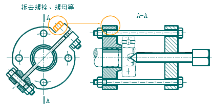 在装配图中,在不致引起误解,不影响看图的情况下,剖切平面后不需表达的部分可省略不画。如图15所示,A-A剖视图中上部的螺纹标准件及与其接触的夹板可见部分都被省略了。