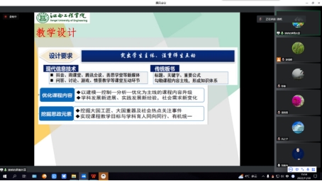 大赛紧扣“推动教学创新,打造一流课程”这一主题,以教学创新设计汇报为竞赛环节,每名选手通过屏幕共享进行本人教学创新设计汇报,汇报结束后由评委进行点评与提问,选手回答问题,评委根据参赛选手的现场表现进行打分。