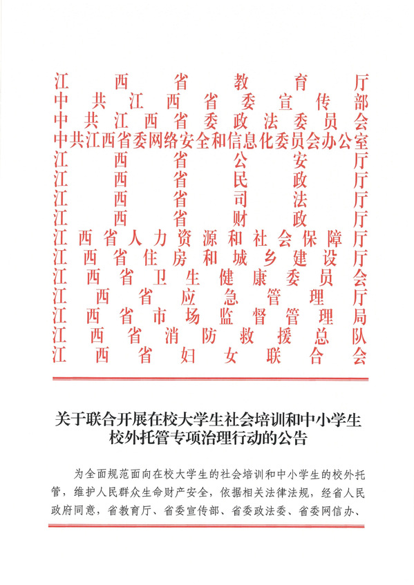 关于联合开展在校老员工社会培训和中小员工校外托管专项治理行动的公告