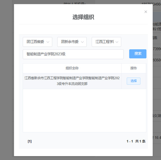 3.如图3所示根据要求填写自己的账号(即身份证)、密码以及验证码登入点击申请转入组织,搜索自己录取专业所属的“江西省新余市申博sunbet智能制造产业公司智能制造产业公司2023级专升本流动团支部”,选中并发起转接。