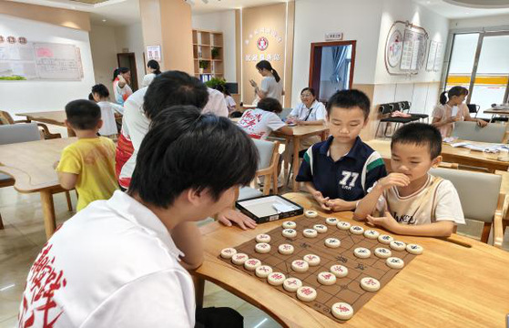 在社区活动室内,一场场别开生面的互动热烈展开。“楚河汉界”摆开,实践队队员们与孩子们下起了象棋。队员们耐心地为孩子们讲解象棋的规则、棋子的走法,从“马走日,象走田”到各种战术策略,孩子们听得津津有味,稚嫩的脸上满是专注;画画的区域同样热闹非凡。队员们准备了五颜六色的画笔和洁白的画纸,引导孩子们发挥想象力,描绘心中的美好世界;玩积木的环节更是将欢乐推向高潮。形状各异的积木在孩子们手中仿佛拥有了魔力,变成了高楼大厦、桥梁和汽车。队员们和孩子们一起合作搭建,大家你一块我一块,相互配合,共同构思。