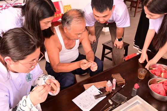 随后,一场非遗技艺传承体验(传统镌刻)让实践队感受到红色文化的创新表达。在传承人钟师傅指导下,队员们屏息凝神,学习方寸木石间的精妙技艺。冰冷的刻刀传递历史温度,每一次下刀都是对匠心精神的感悟,更是对苏区人民勤劳智慧与坚韧精神的传承,深感守护文化根脉的时代责任。