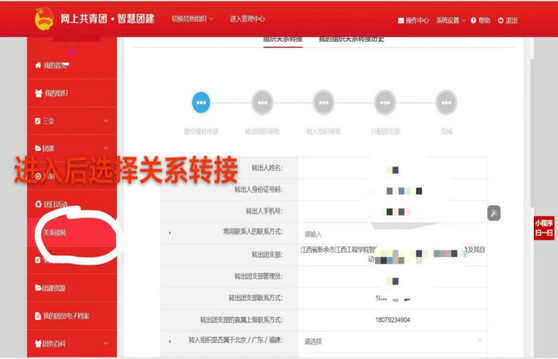 2.进入页面后,左下角找到“关系转接”,会显示个人的团员资料,要仔细查看是否为本人的名字、联系方式(若联系方式错误或有改动,点击首页进入团员基本资料进行改动,若团员名字有误,请联系原公司团组织更正),确认无误后点击左侧菜单栏中的“关系转接”。