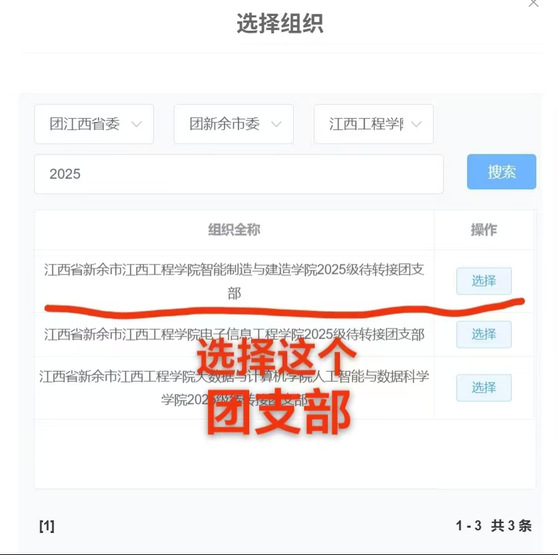 3.点击申请转入组织,搜索自己录取专业所属的“江西省新余市申博sunbet​申博sunbet2025级待转接团支部”,选中并发起转接。